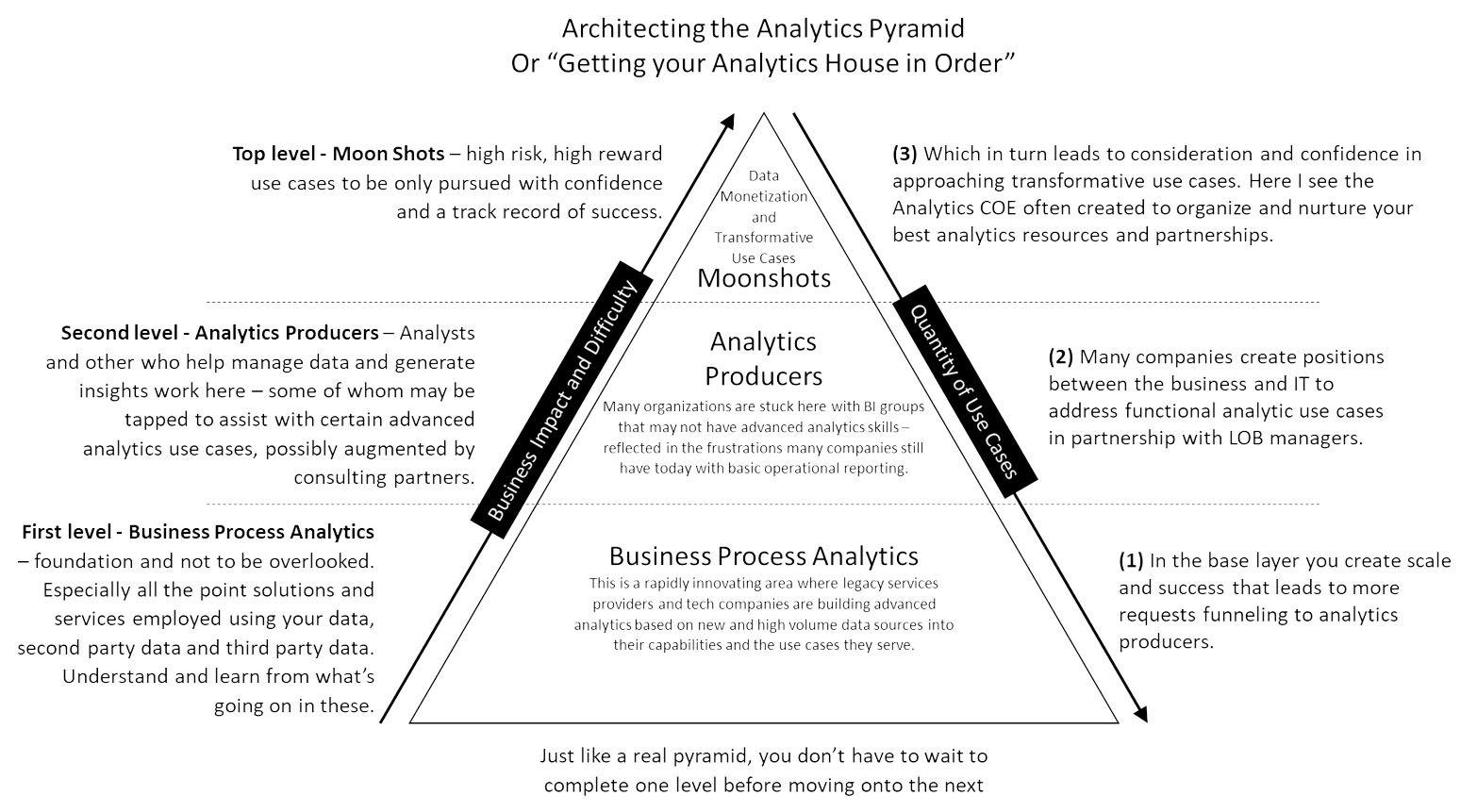 2) The depth of AI at each vertical, which involves the analytics pyramid mentioned in this article (foundational analytics vs. moonshots) as well as considerations such as ethics and long-term roadmap.
